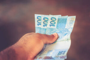 Money notes (Brazilian real) on hand. Background blur.